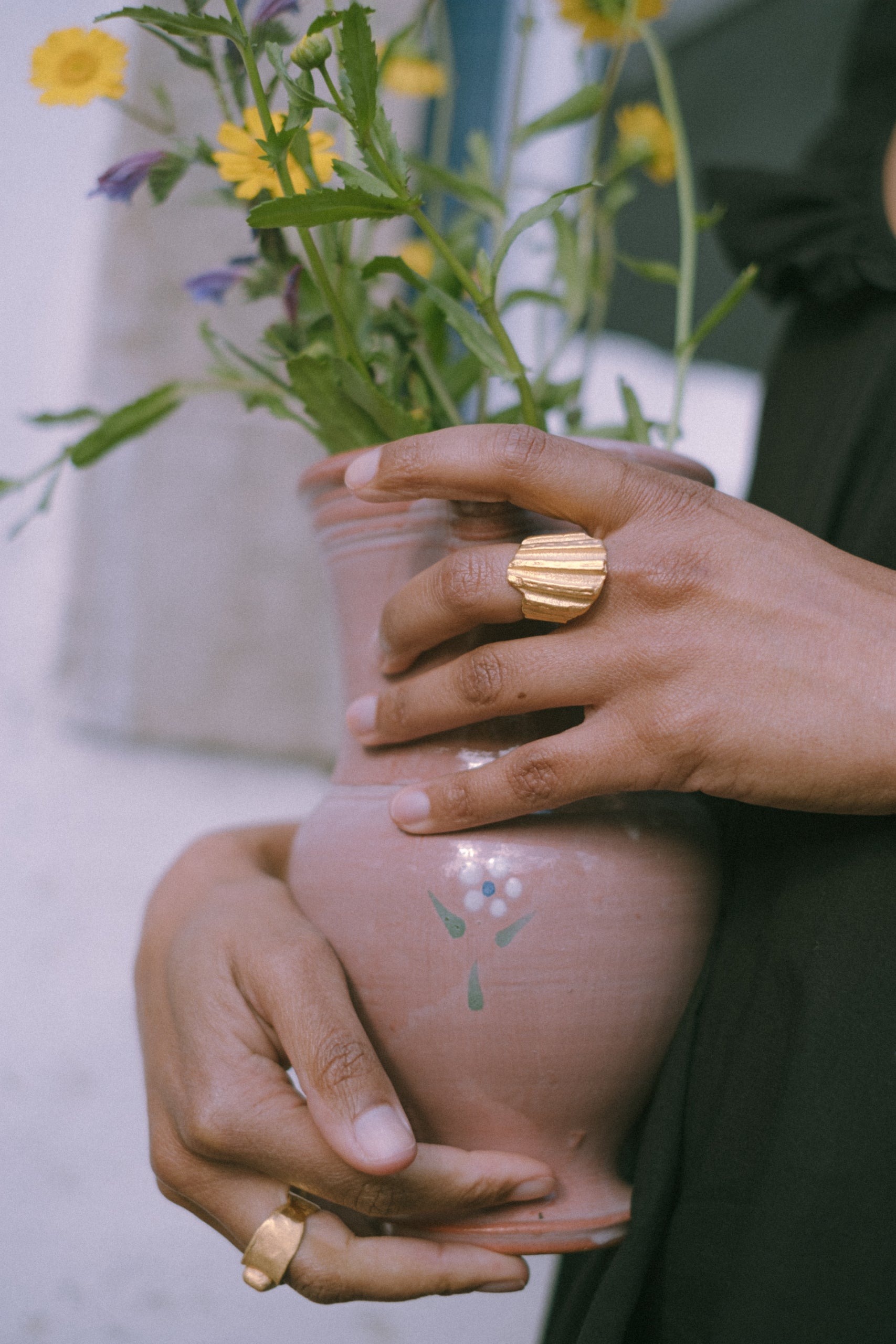 The rings range from more discreet styles to those with geometric shapes or central elements, and can be styled together or separately. "When I create a piece of jewelry, I don’t have a specific woman in mind – I create them as if they were for myself, with all the different references that occupy my mind," explains the jeweler, who draws inspiration from traditional Portuguese craftsmanship techniques – such as ceramics, basketry, and weaving – and a keen observation of the world, refined with each new stamp in her passport. "Perhaps that’s why the most rewarding feeling – and what I aim for with my work – is seeing someone wear my pieces, knowing that in some way I am part of their daily life and that I am likely contributing to them feeling more beautiful or confident."