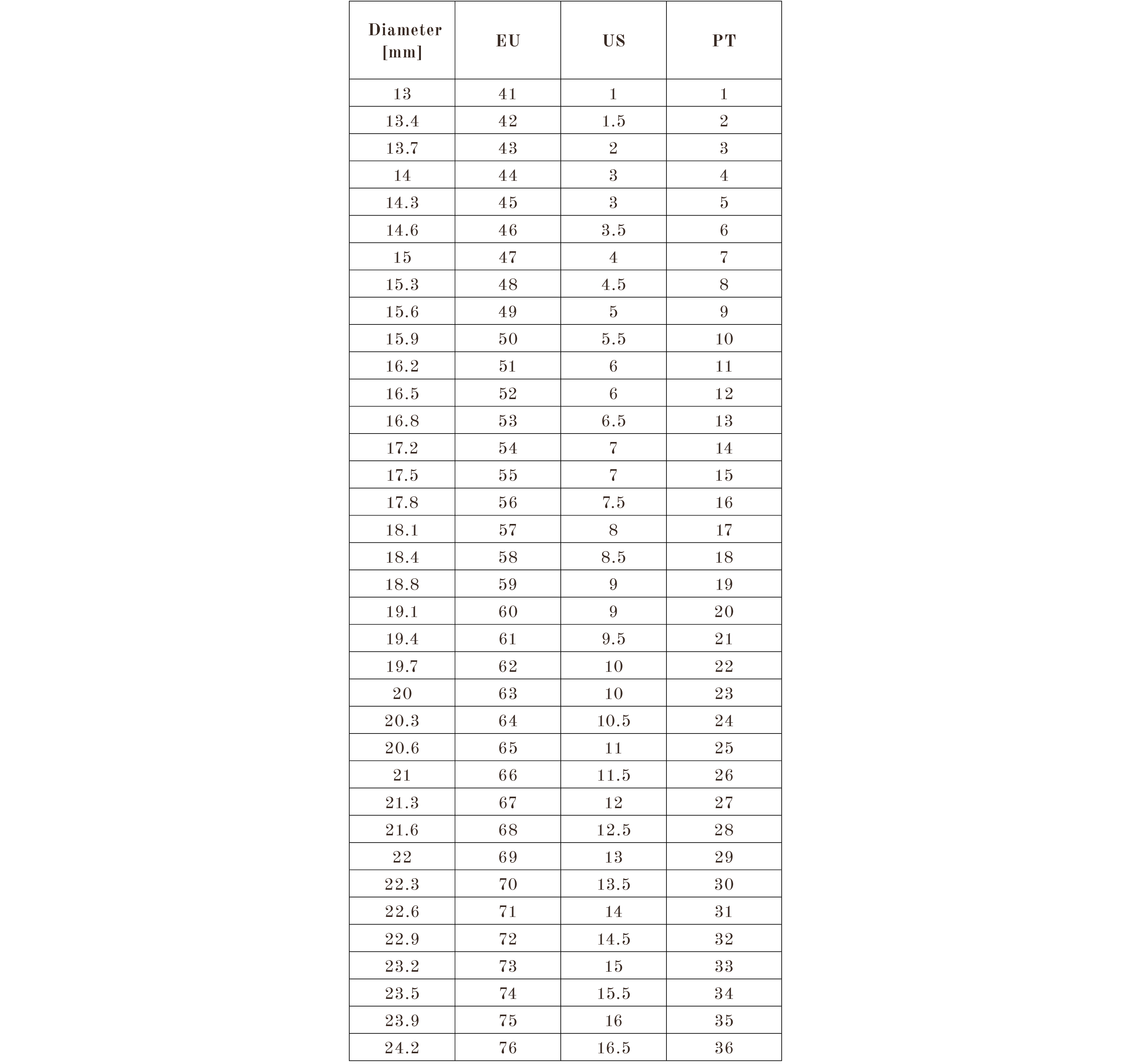 If you have any questions about your size or if your size is not in this chart, please email hello@raquelpocojewellery.com