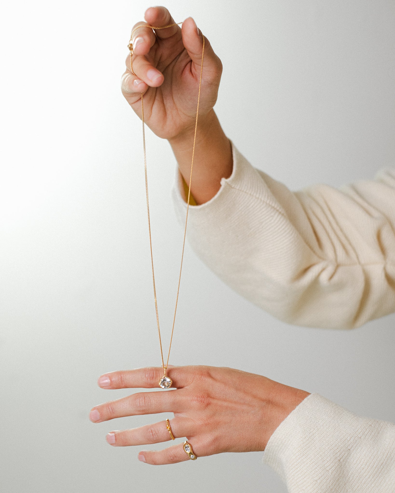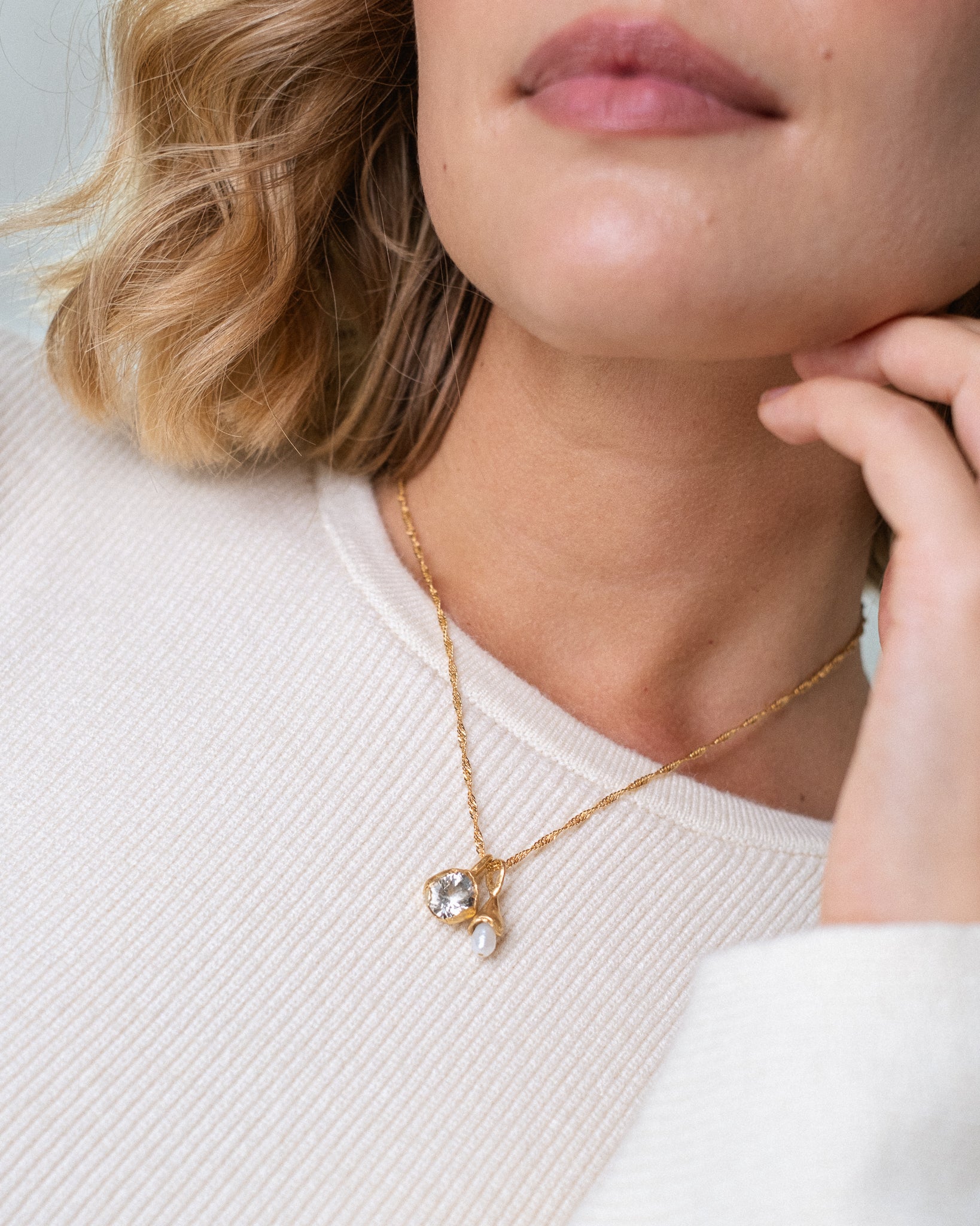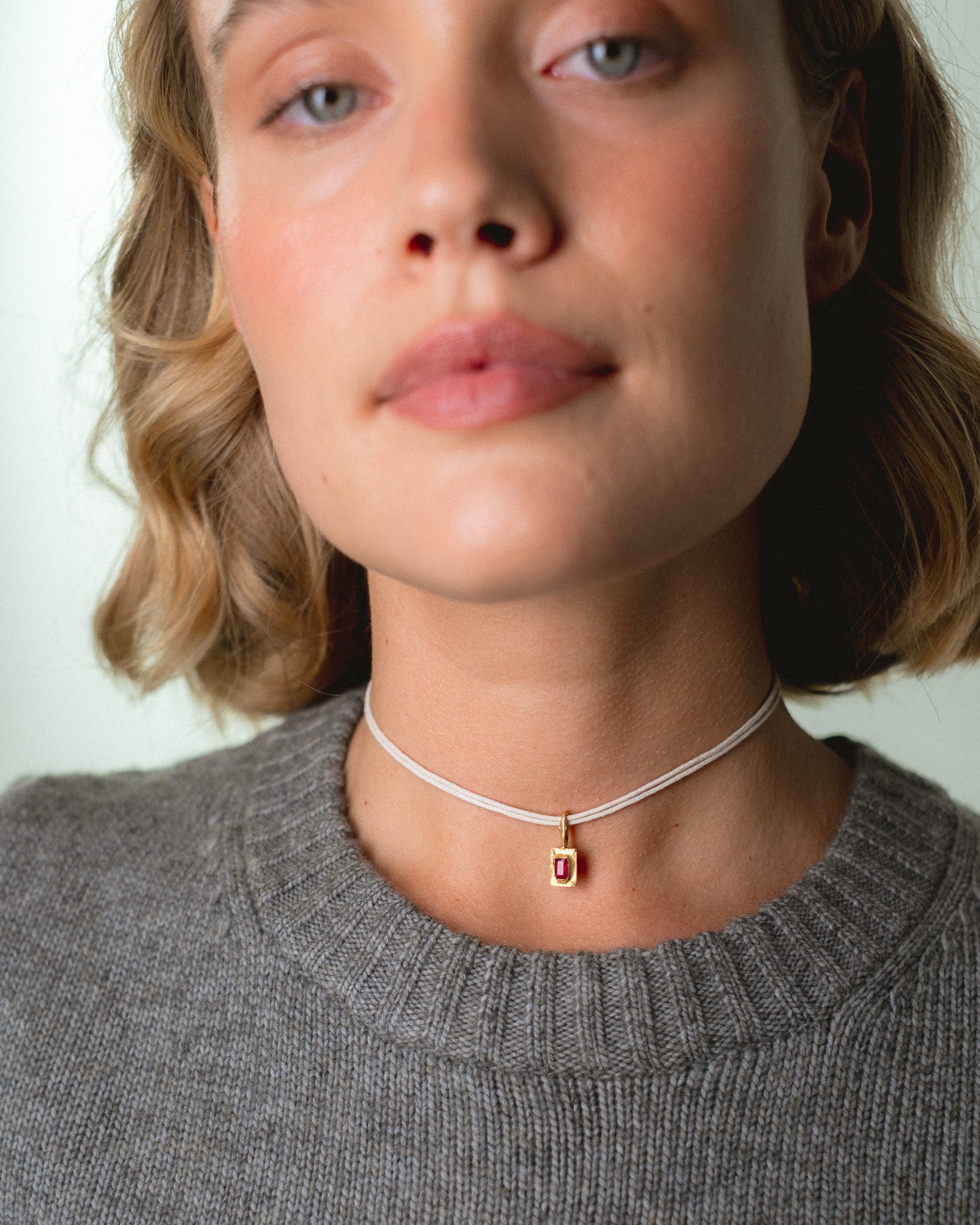 Each piece carries its own quiet presence: the calm of aquamarine, the strength of ruby, the softness of quartz, the purity of pearl. More than adornments, these pendants are small talismans, created to accompany everyday life, gentle reminders to pause, to listen, and to remain present.