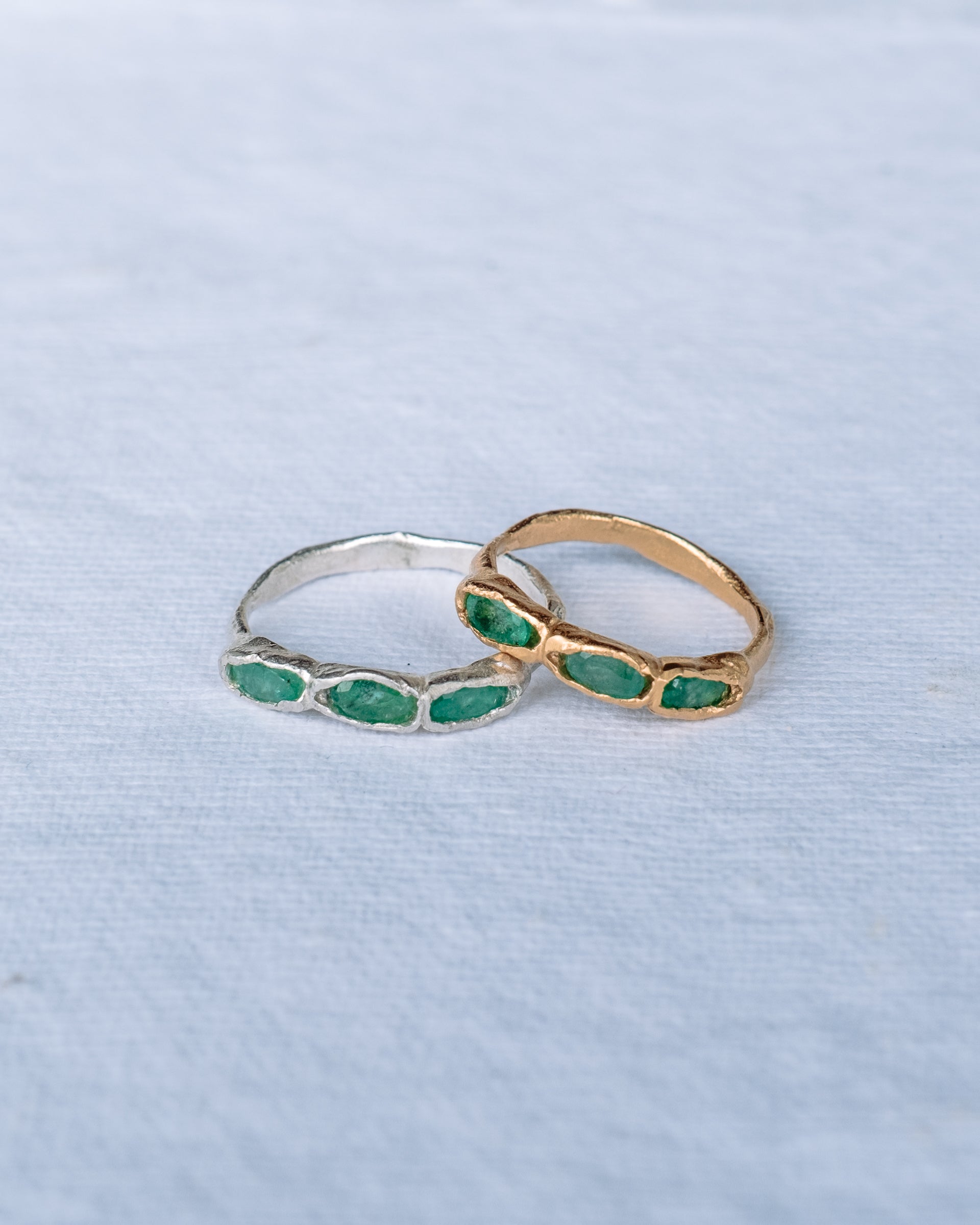 With three raw emeralds placed side by side, this ring evokes the comfort of a quiet morning and a freshly brewed cup of coffee.