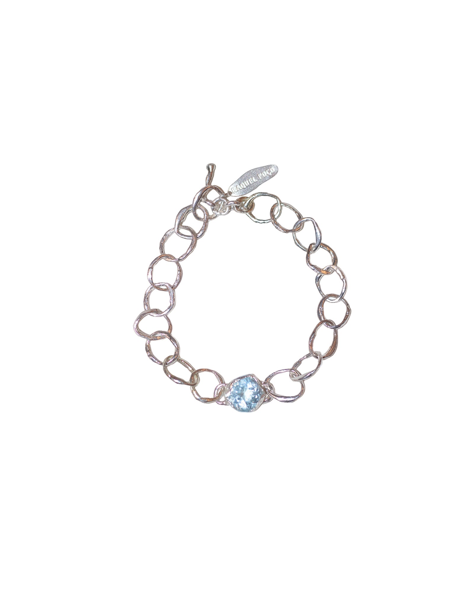 This bracelet features interlinked rings and a single blue topaz, sparkling like clear skies and warm days.