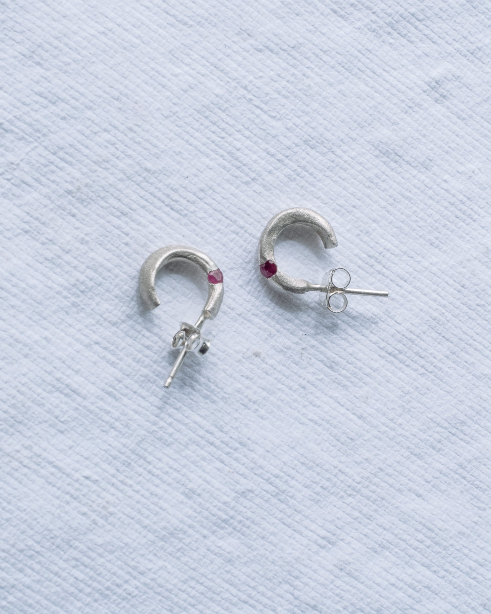 Inspired by the softness of a light drizzle, these earrings are a gentle statement piece. With a rounded shape and a subtle matte texture, they hold a small ruby that brings a quiet glow. Made in silver, gold-plated silver, 9k or 19k gold.