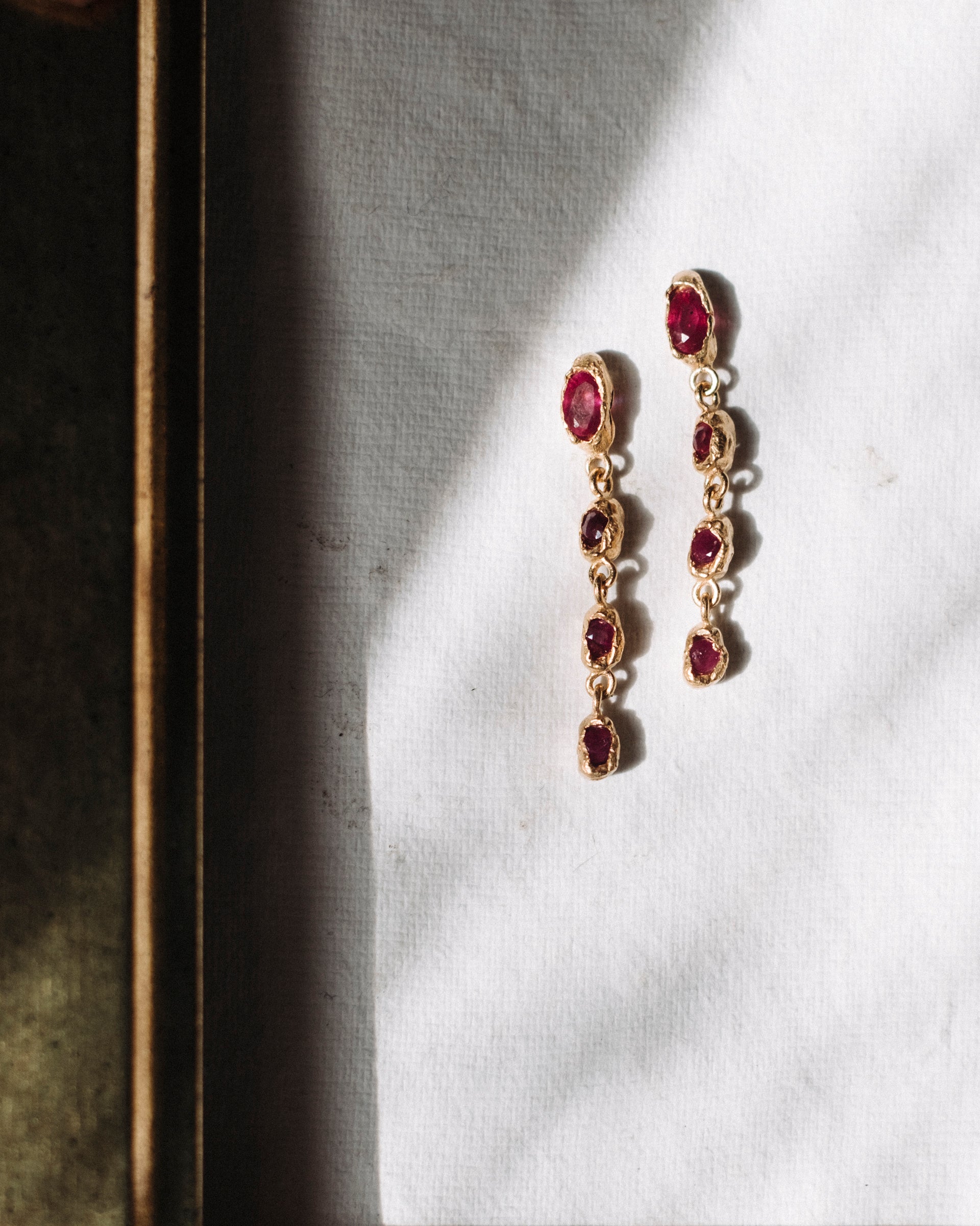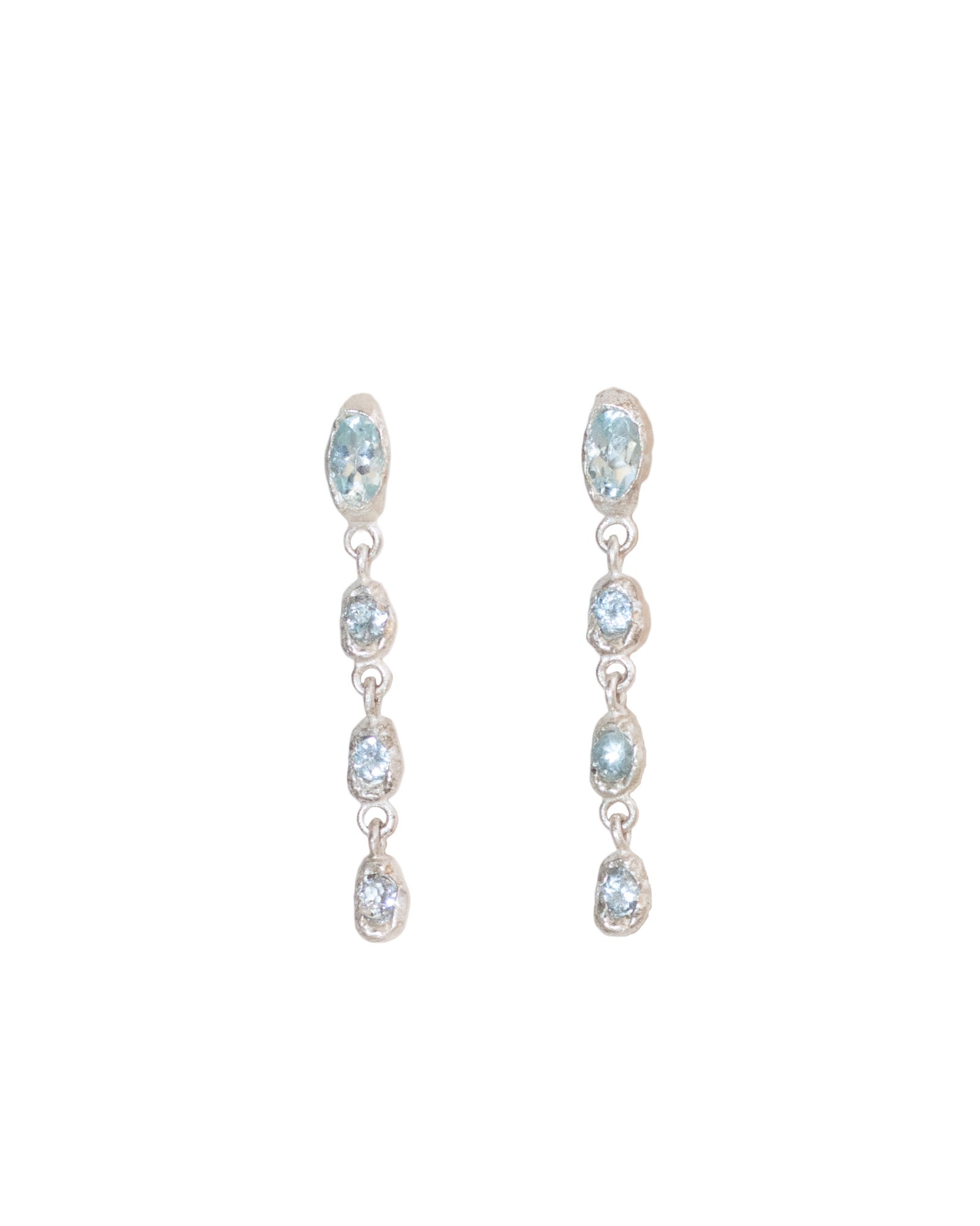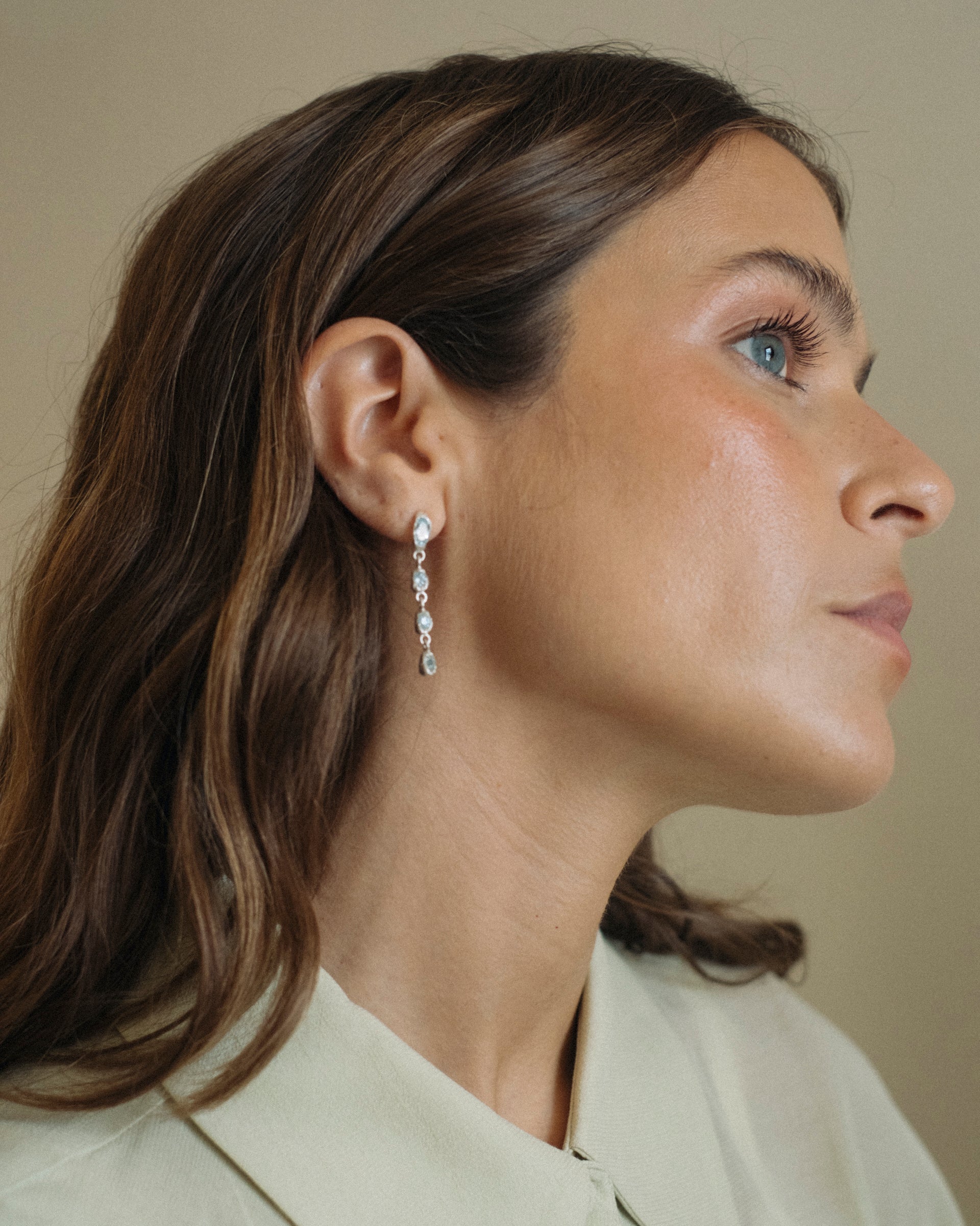 The Guarda-Sol Earrings are a graceful celebration of movement and light. Crafted in sterling silver, gold-plated silver, or 9K gold, these elegant drop earrings are long and delicate, composed of multiple gemstones arranged in a linear design, creating a subtle cascade effect.