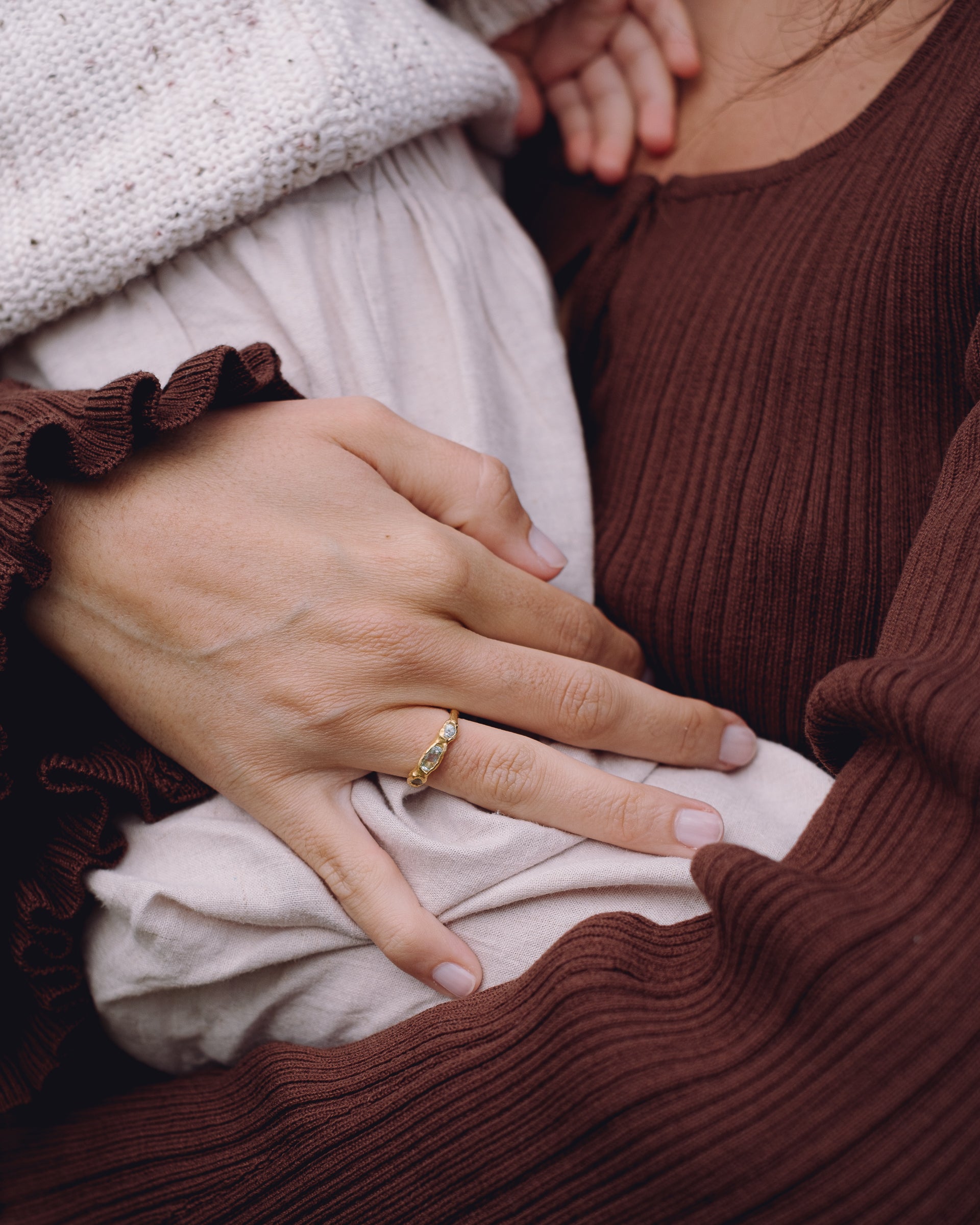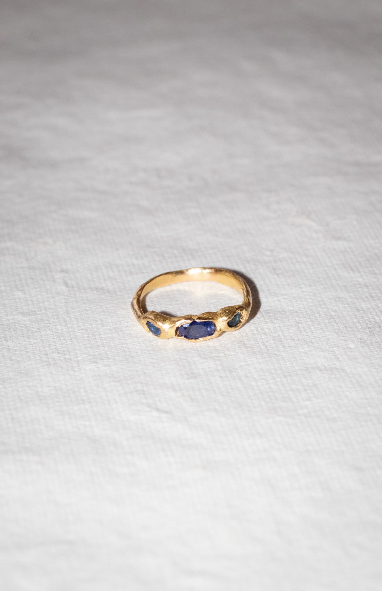 Like a quiet moment before bedtime, this ring captures the warmth of small rituals. With three natural gemstones — available in emerald or sapphire — set into its softly textured band, it’s a piece that feels both personal and poetic.