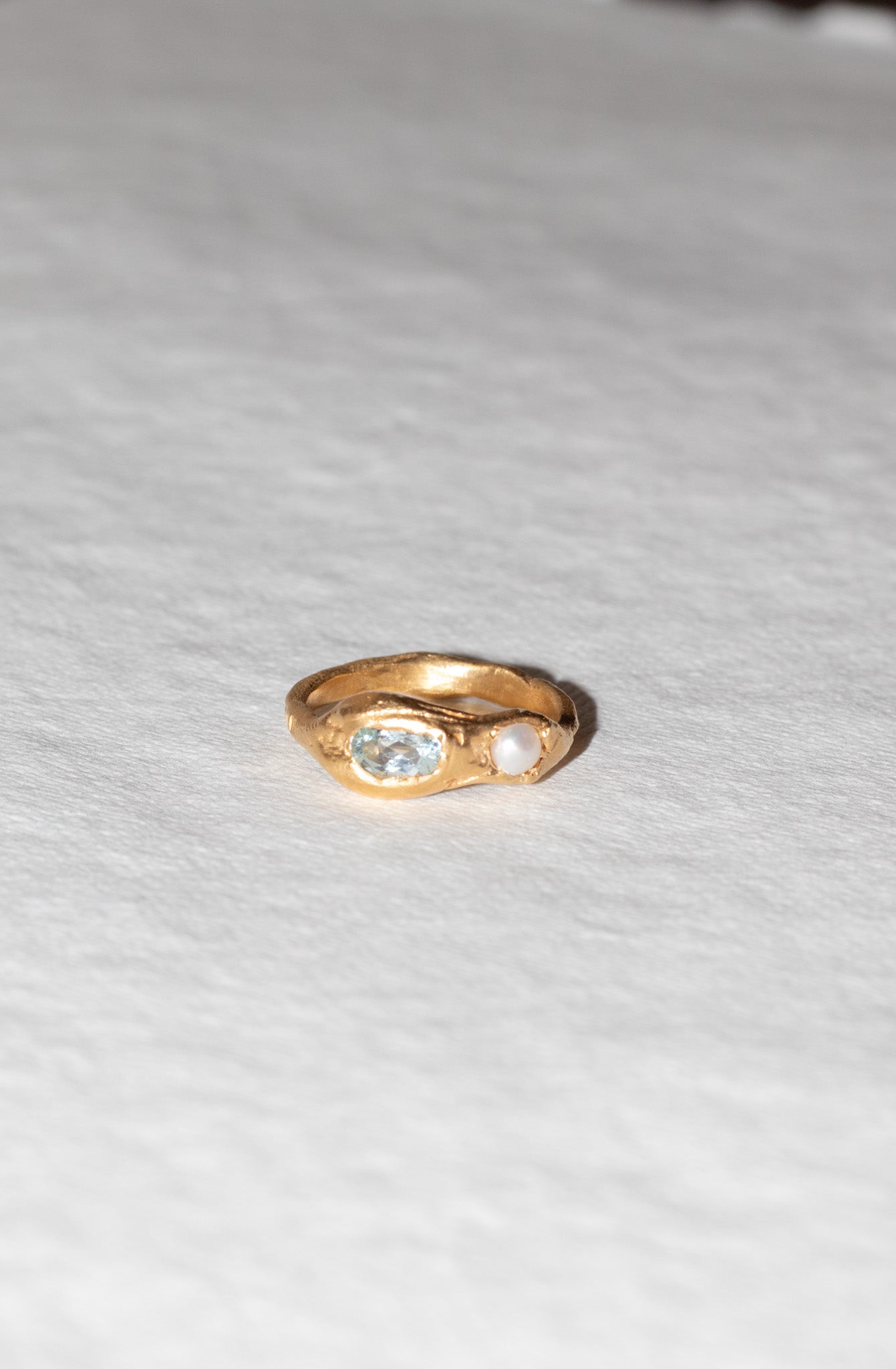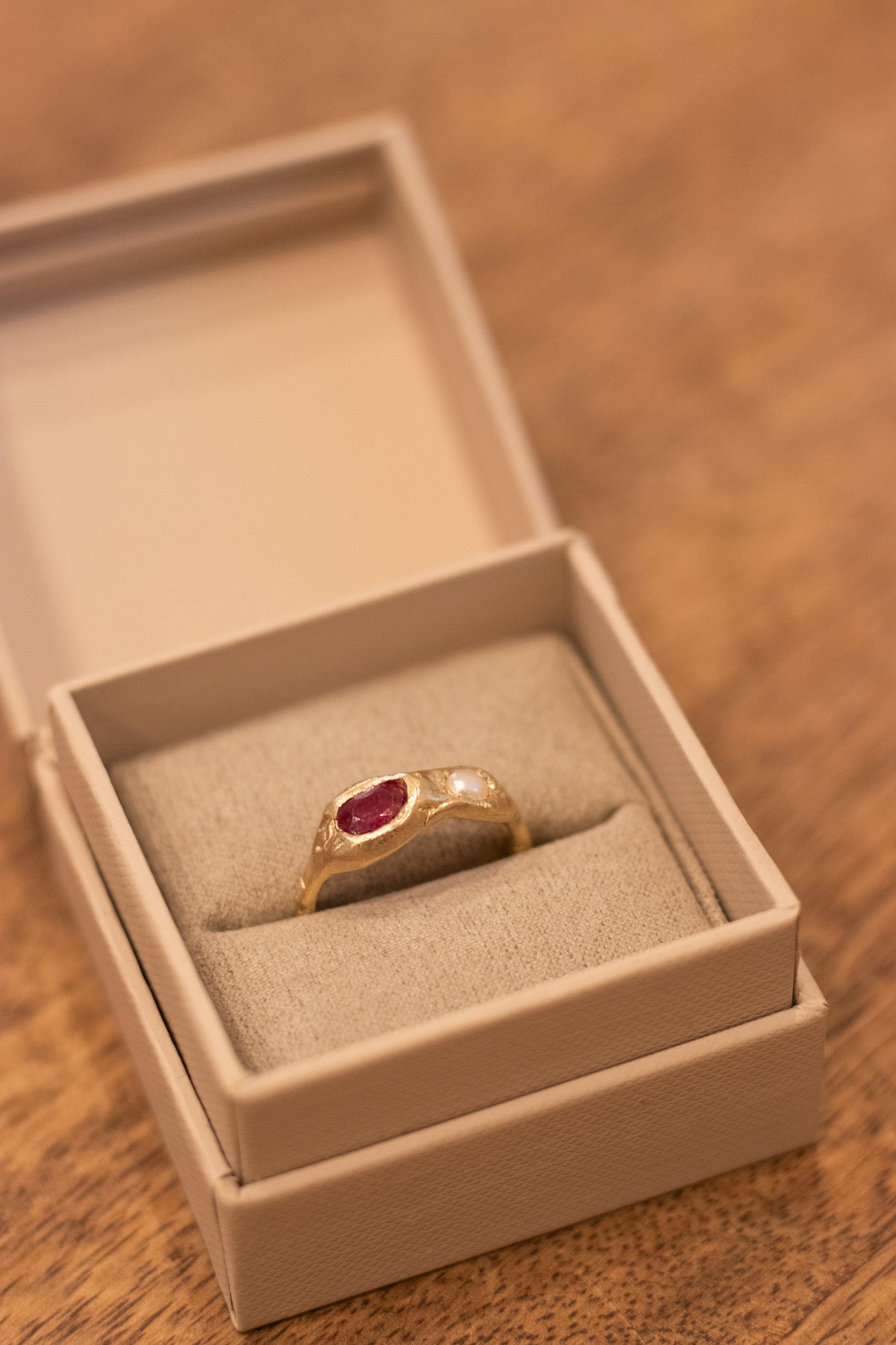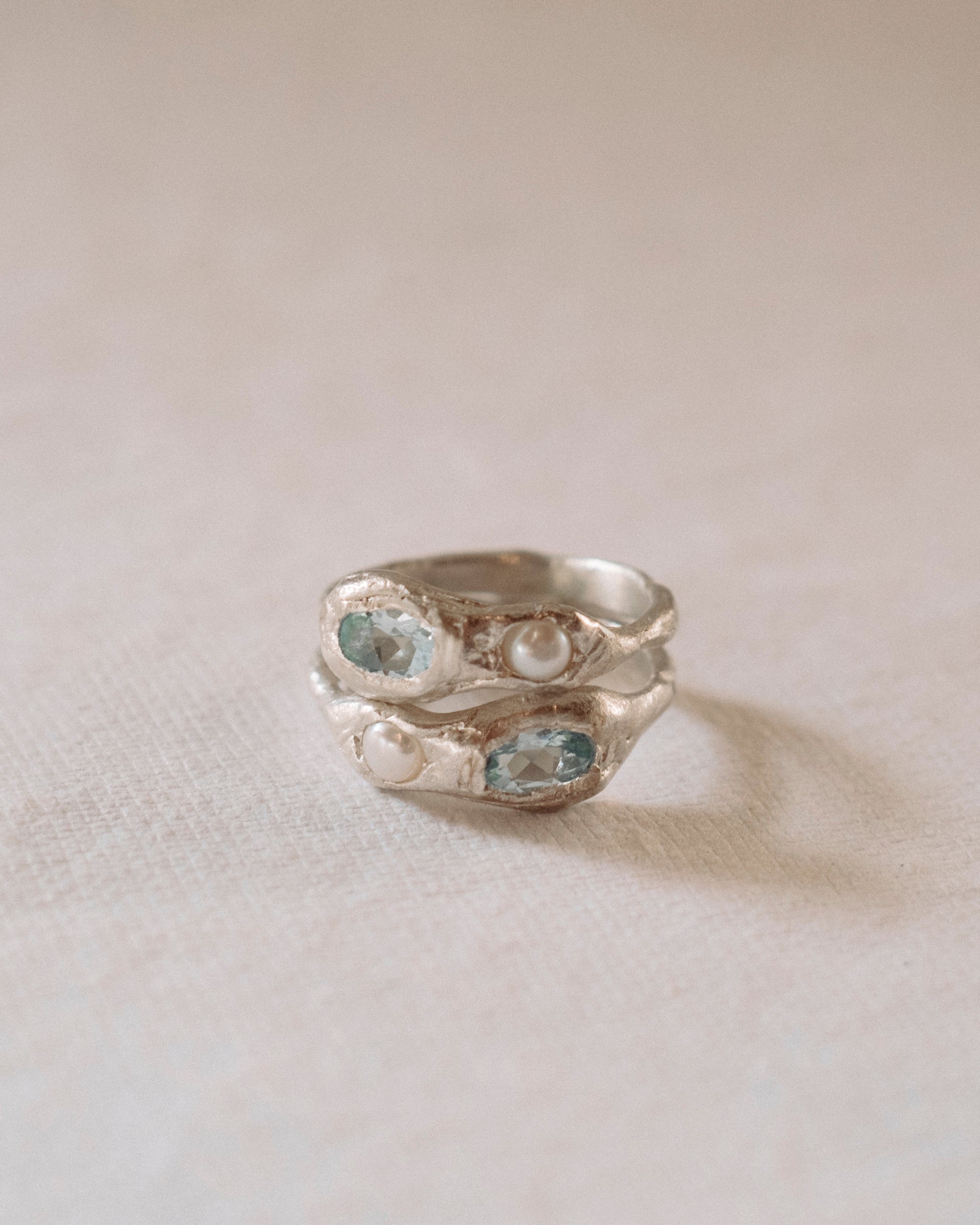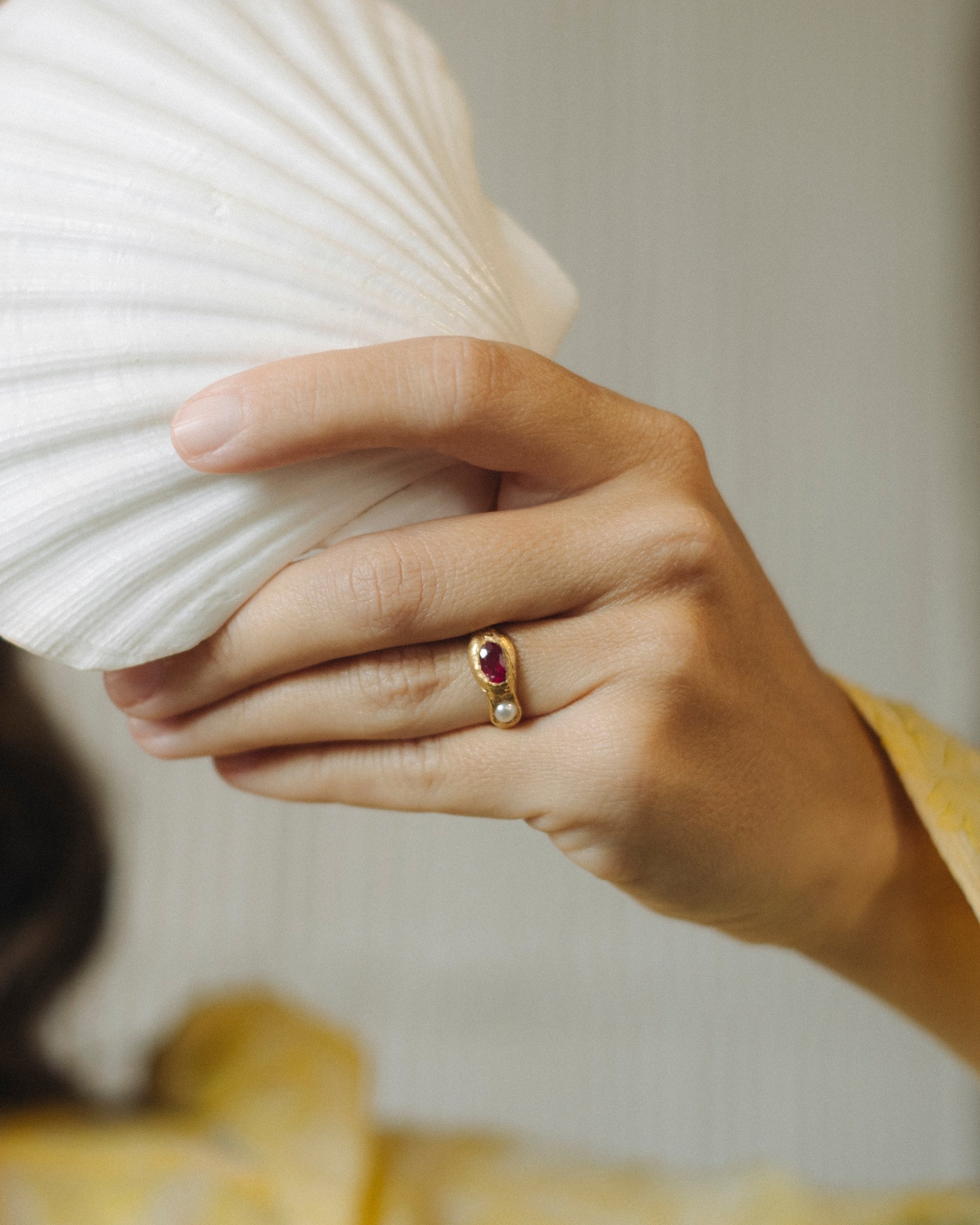 The Maar Ring stands out with its unique design and thoughtful details. Crafted in sterling silver, gold-plated silver, or 9K gold, it features two exquisite stones: a vibrant ruby, aquamarine ou sapphire paired with a luminous pearl.
