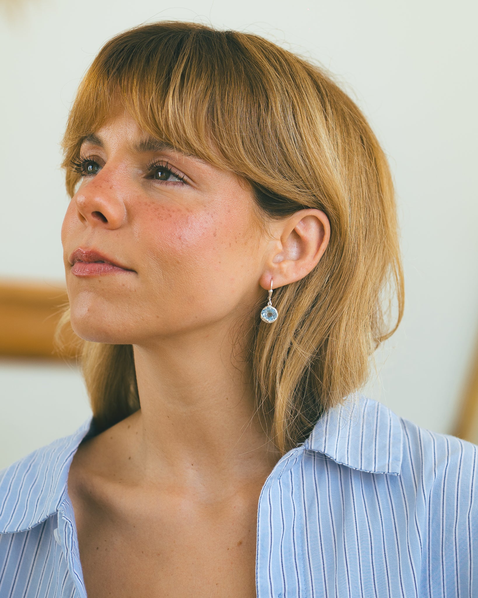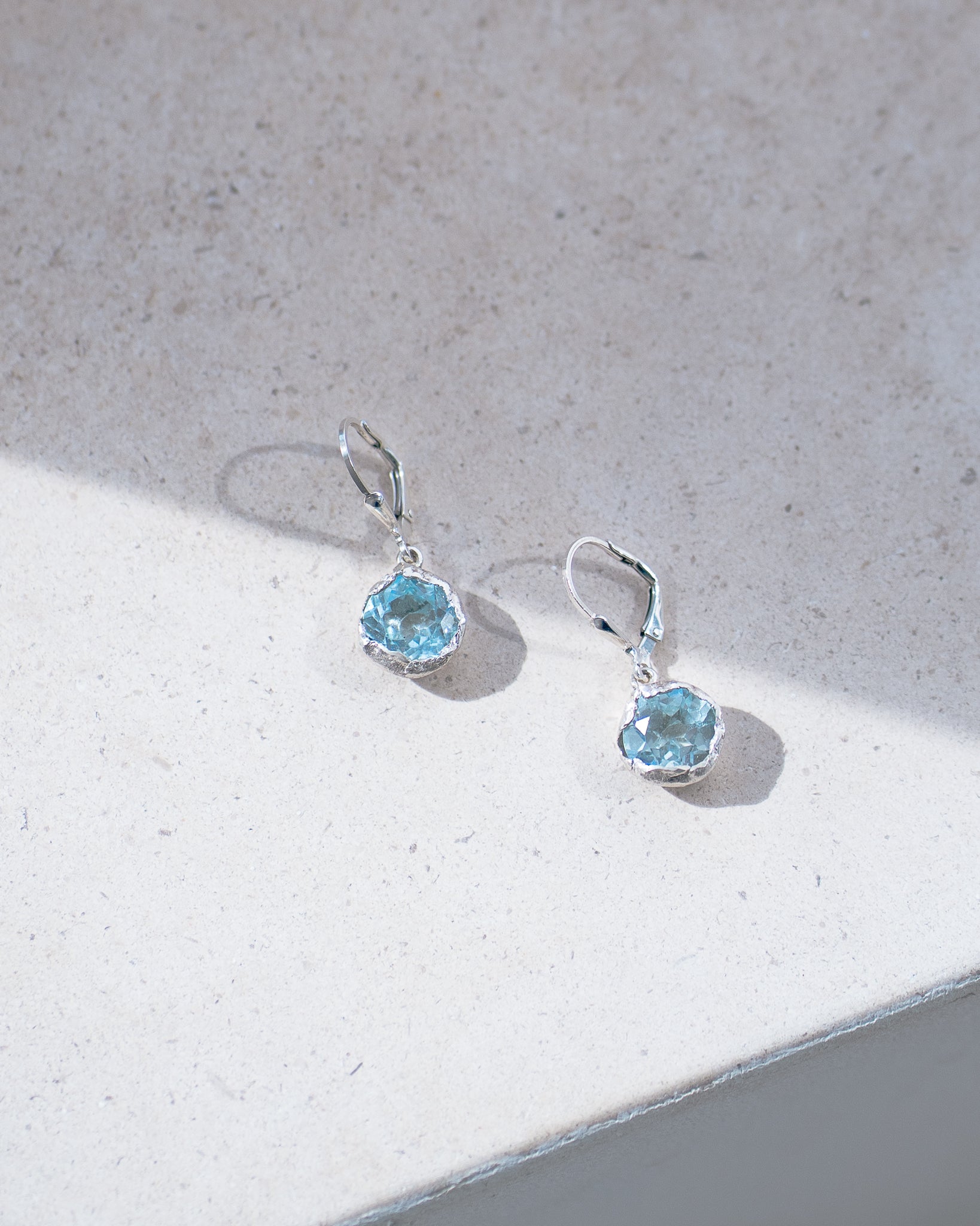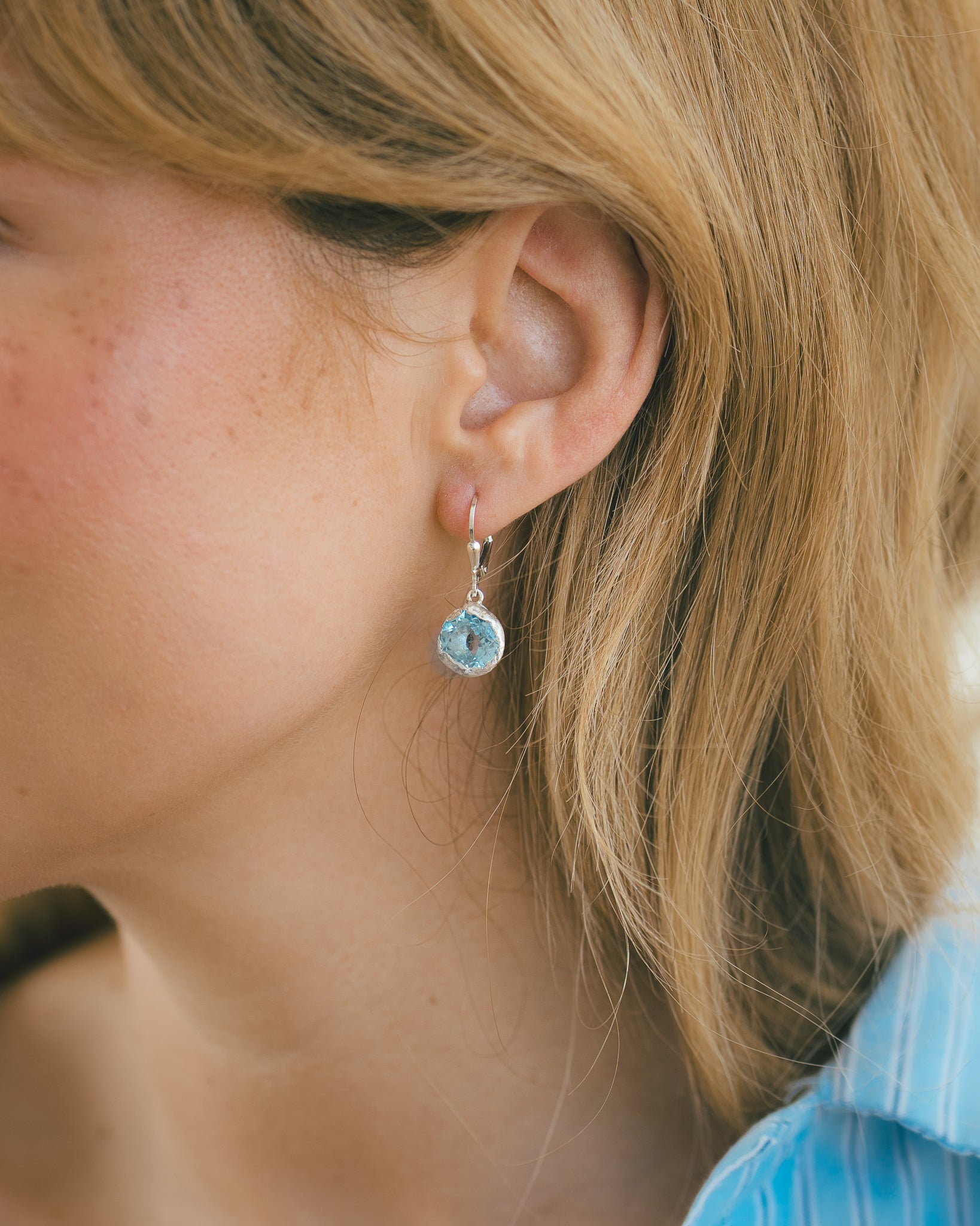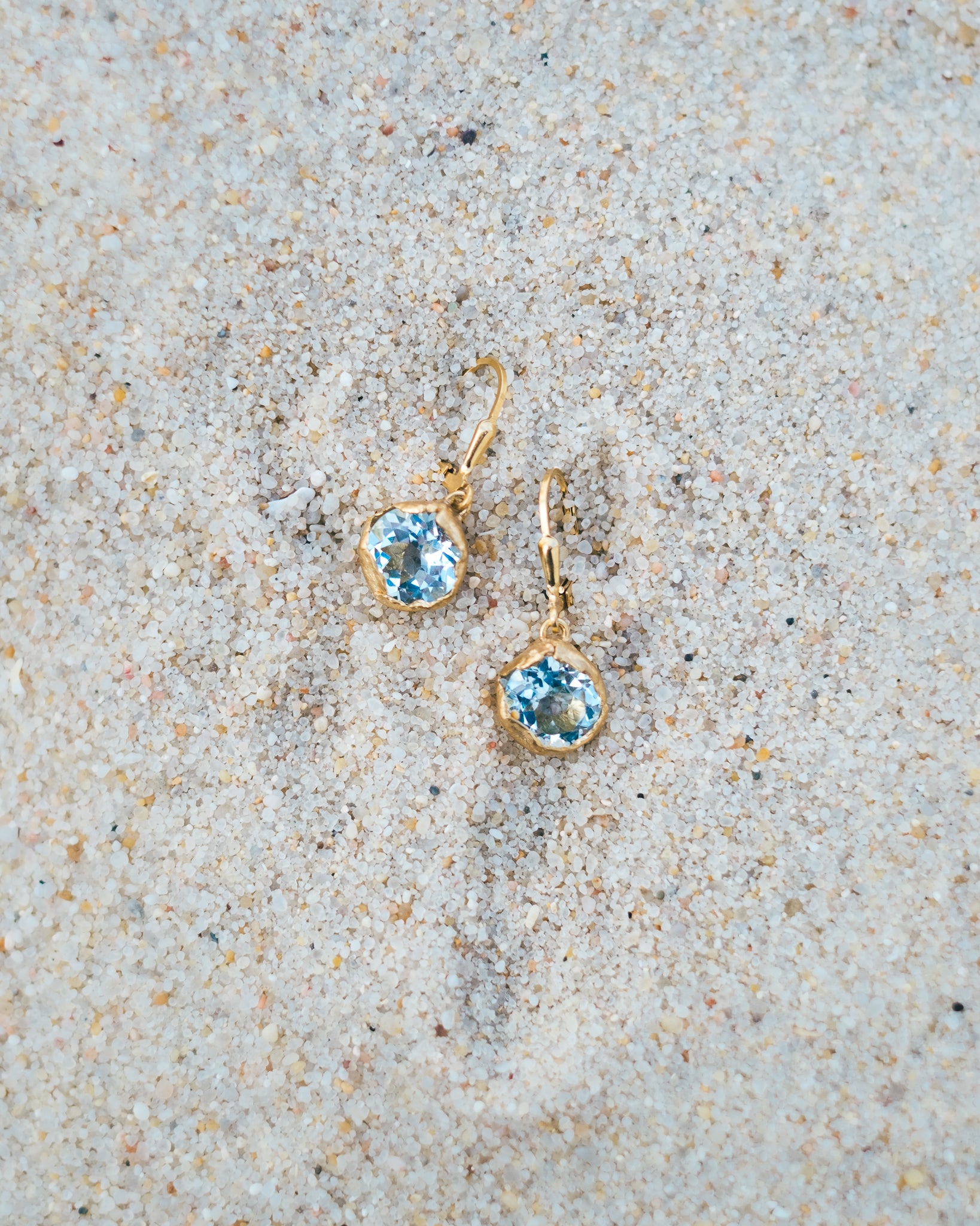 With luminous round blue topaz stones, these earrings bring out the glow of warm summer tones — like crystal water meeting golden light.