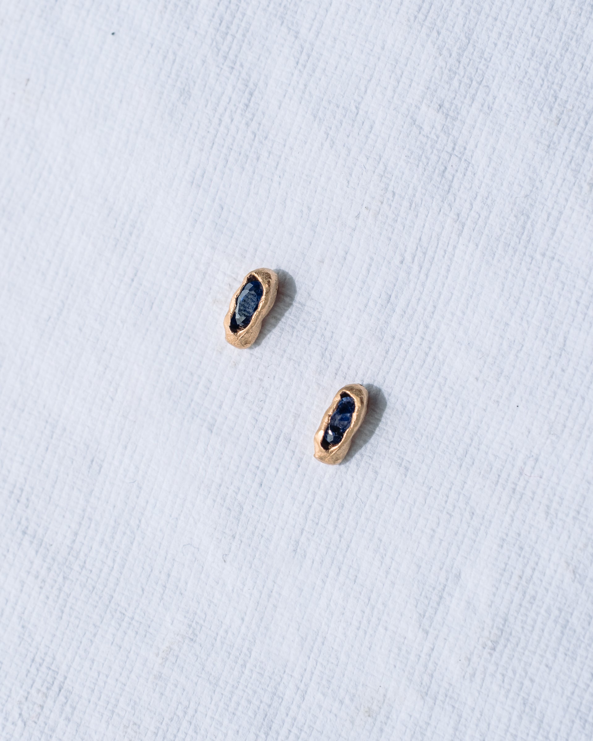Small and delicate, these stud earrings are perfect for everyday wear. Made in silver, gold-plated silver, 9k or 19k gold, and set with aquamarine or sapphire, they add a subtle touch of colour and texture — like the feeling of grass under your feet on a quiet morning.