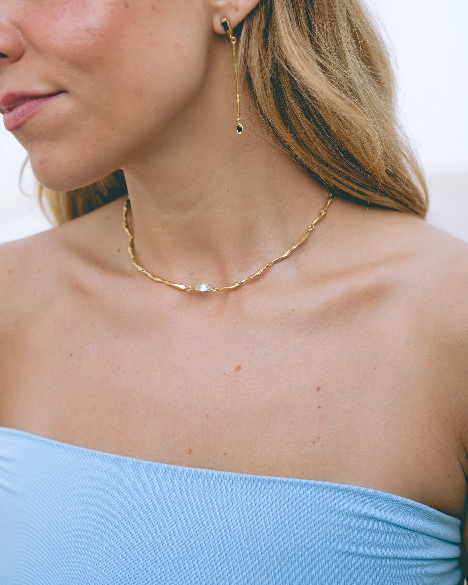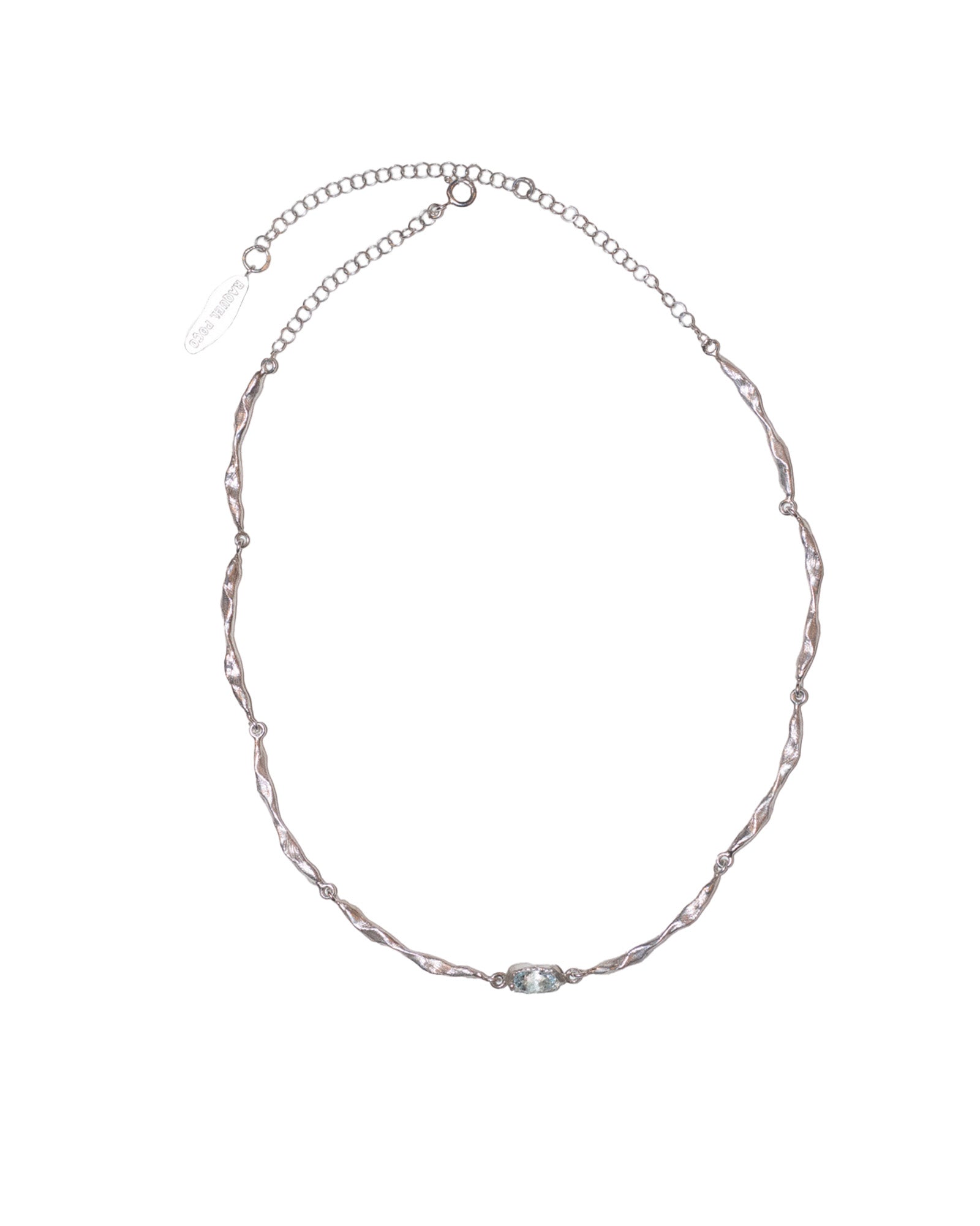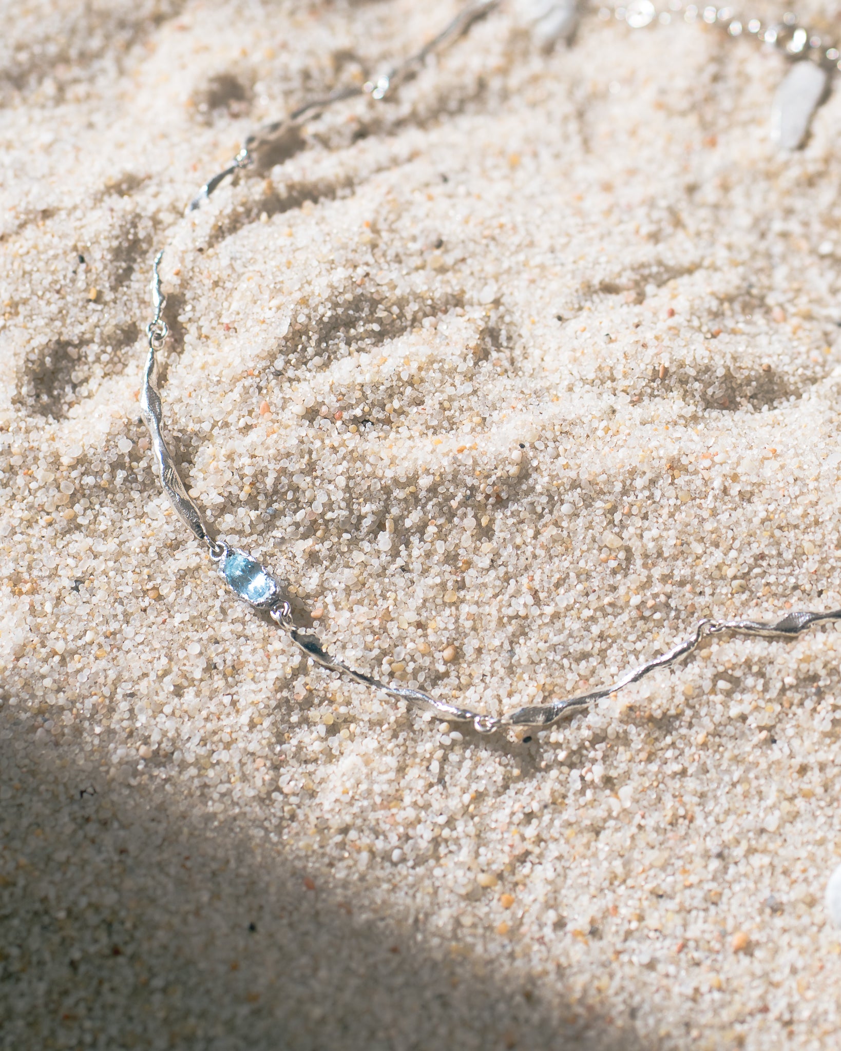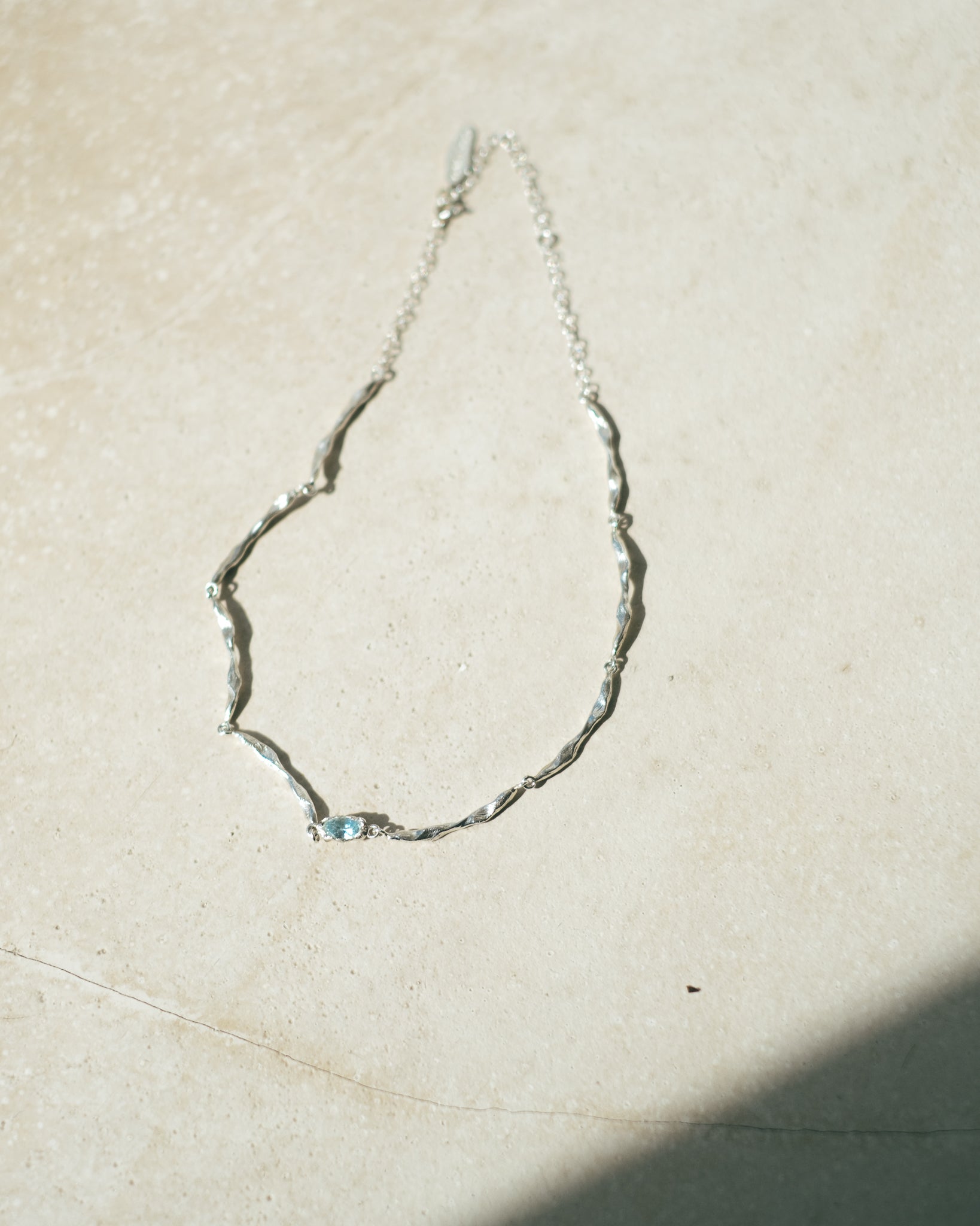 This delicate necklace, adorned with shimmering aquamarine stones, evokes the gentle murmur of waves meeting the shore.