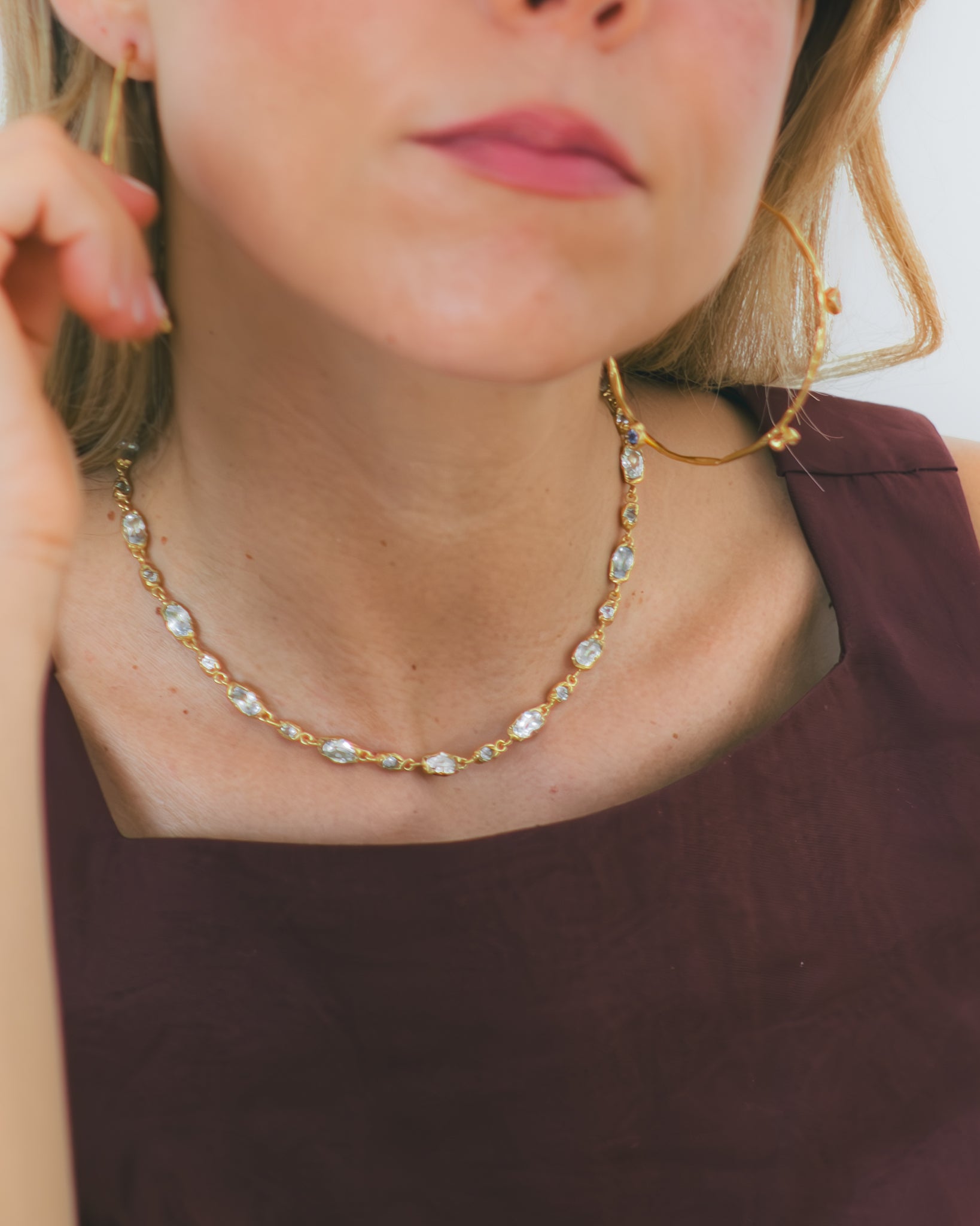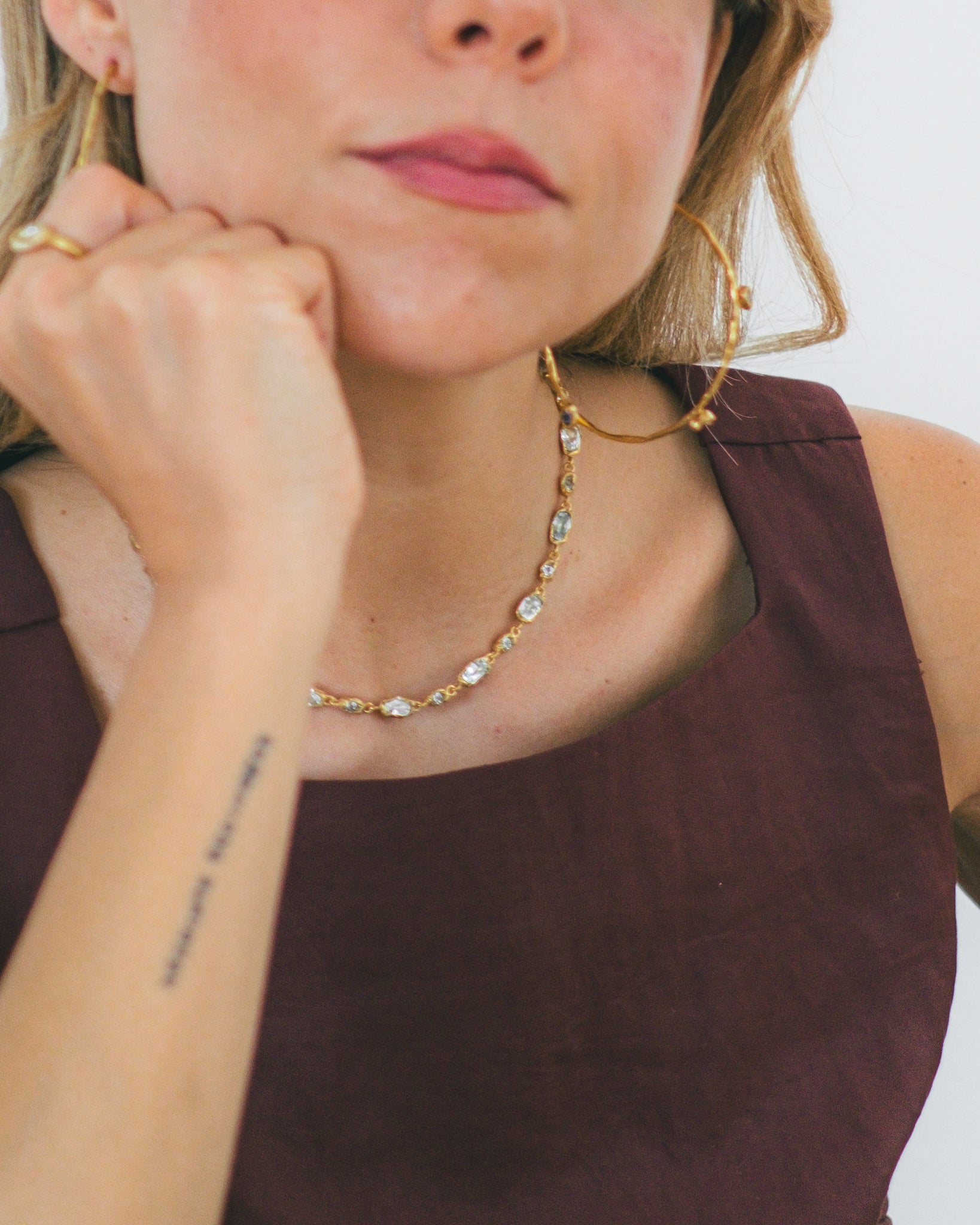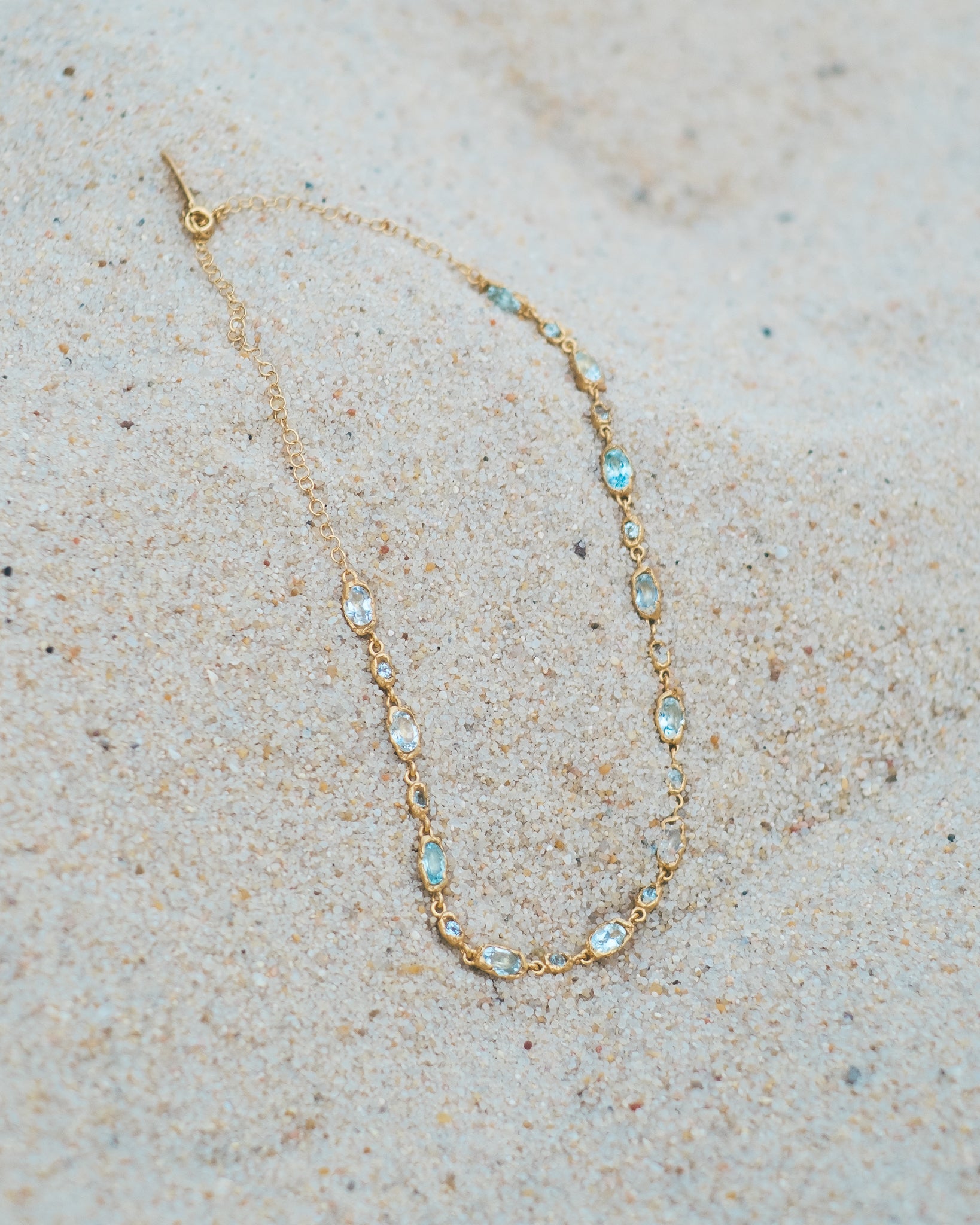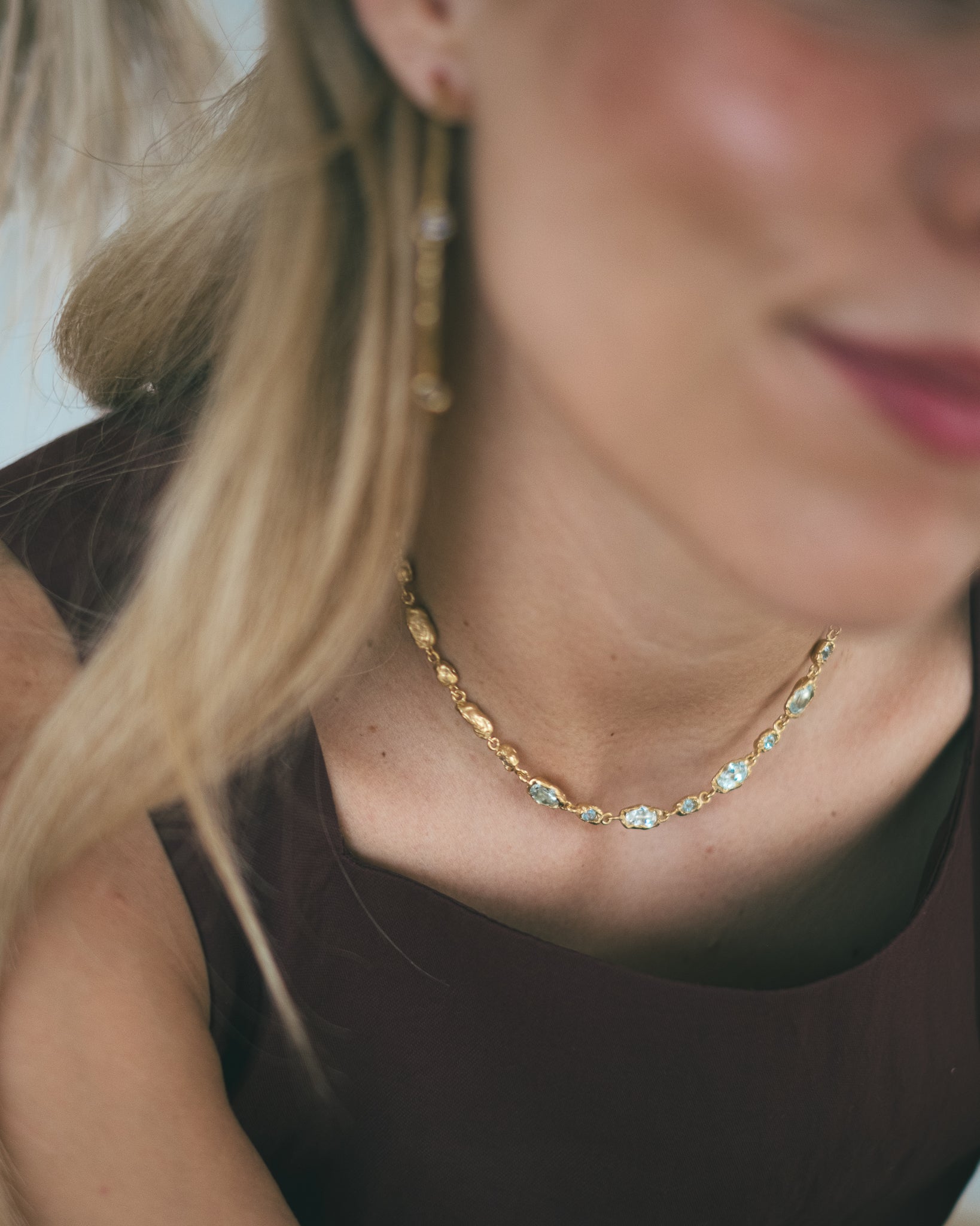 Strung with delicate aquamarine stones, this necklace feels like sunlight flickering on water — calm, fluid, unhurried. Each piece moves gently with you, like time itself on a summer day.